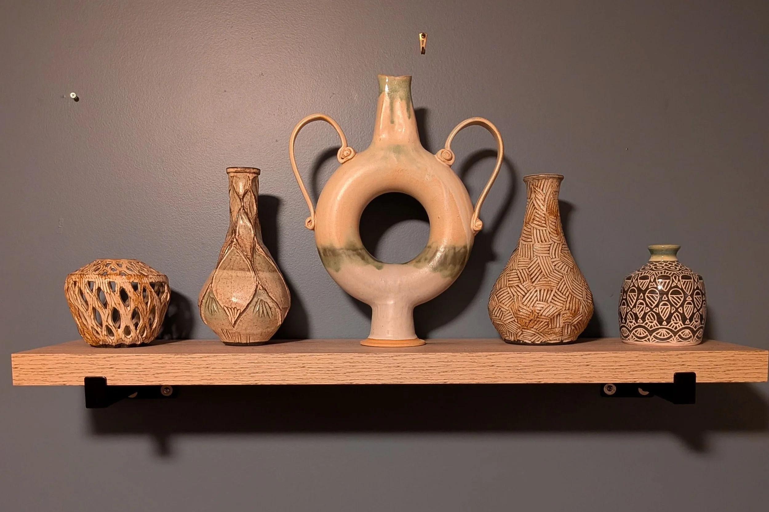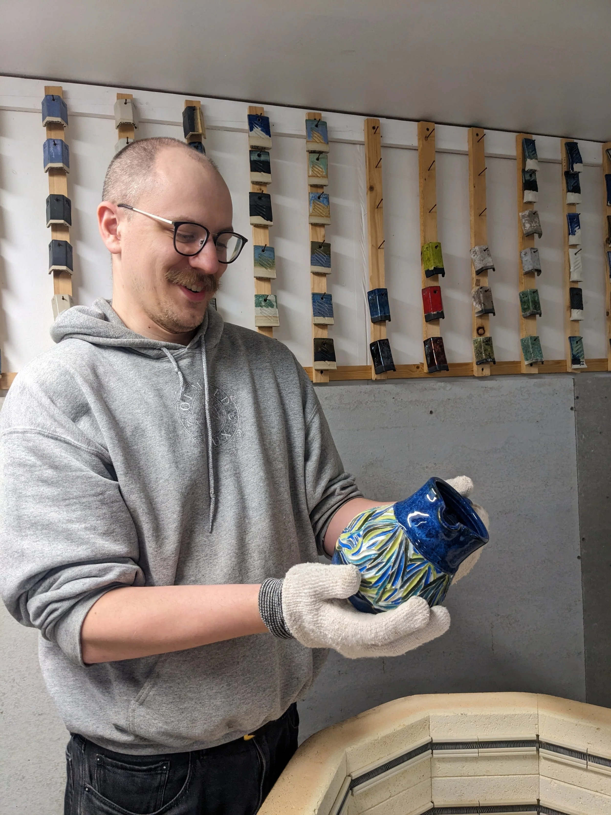 “I have been using the potters wheel since high school, continuing to focus on it throughout community college at FLCC. The largest increase in skill, exposure, and experience though, was attending Nazareth Univeristy (2007-2009), focusing fulling on ceramics and sculpture under Mitch Messina. After college, I took a long break from ceramics for a bit of a life detour, and around 2022 came back to it with a renewed sense of passion for wheel throwing. I'm now the studio tech for Jason Ferguson's community studio in the Corn Hill area, and create all my work out of that space.”